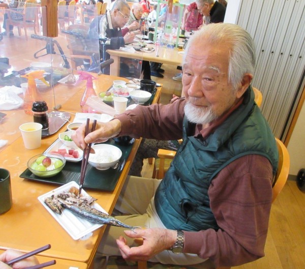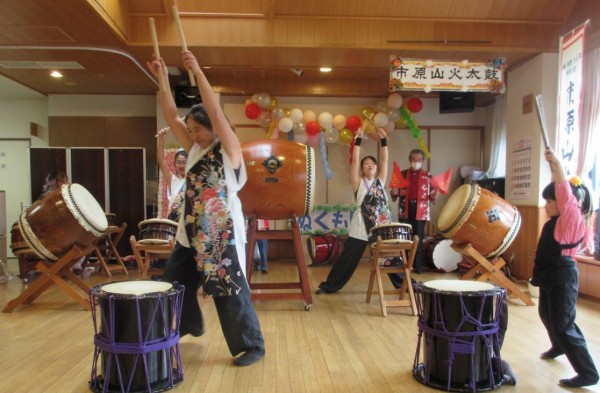市原山火太鼓様の迫力ある演舞に、立ち上がって聞き入る方もあり「凄い迫力」と大歓声。その後はこちらもお楽しみのお食事です。今年はサンマが大きいとの事ですが「ほんとに大きい!」と大変喜ばれていました。