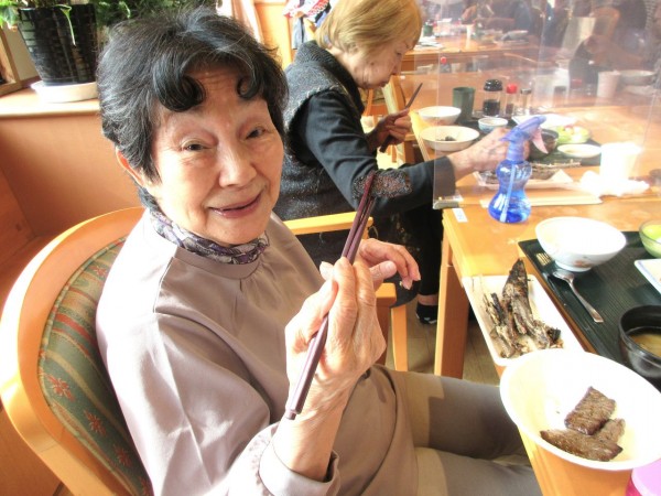 市原山火太鼓様の迫力ある演舞に、立ち上がって聞き入る方もあり「凄い迫力」と大歓声。その後はこちらもお楽しみのお食事です。今年はサンマが大きいとの事ですが「ほんとに大きい!」と大変喜ばれていました。