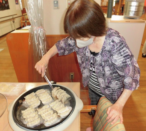 ご利用者様の「アツアツの餃子が食べたい」リクエストにお応えして開催しました『餃子パーティ』。アツアツぱりぱりの餃子をよそり『アツアツ美味しい!』『ぱりぱりいいね』『最高!王将に来たみたい!』と